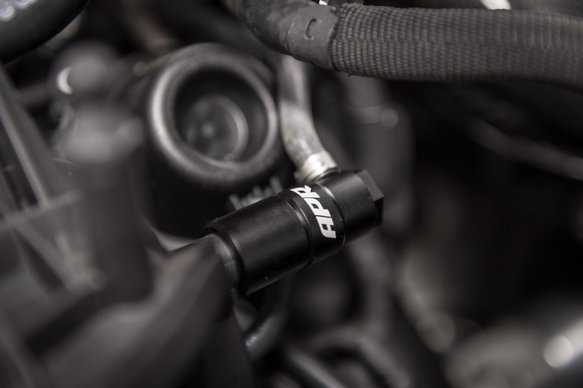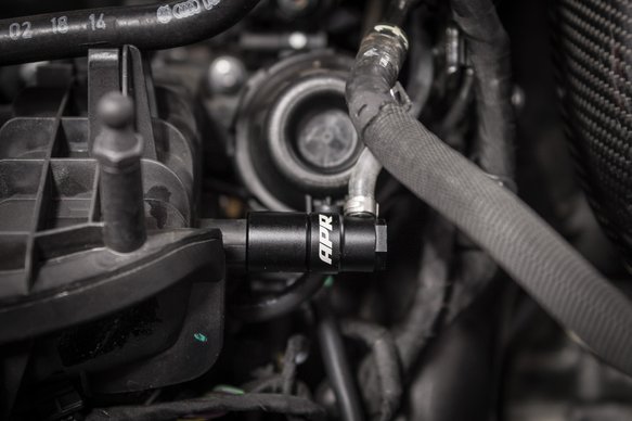 Traditionally boost is tapped by spacing out the factory T-MAP sensor on top of the intake manifold. However, APR’s engineers discovered using this location lead to inconsistencies in intake air temperature readings and potentially a loss of power. Upon this discovery, APR’s engineering team went back to the drawing board and came up with a new and unique solution.Utilizing the included punch tool on a warm engine, a boost and vacuum reference port is easily spread opened on the factory intake manifold. The billet aluminum boost tap then connects to the port and uses dual Viton o-ring seals for leak free operation. The reference hoses connect to the rear of the tap via a barbed stainless steel connection point and conveniently routes through the engine bay.In addition to the boost tap, APR provides several extra components to help suit each individual’s needs. For those requiring more than one reference source, a T-fitting allows for more tapping points. In the case where a mechanical boost gauge is used, the brass restrictor pill limits flow and cures gauge buzz. Just less than 100 inches of 200 PSI hose is included with OEM style ear clamps and black cable ties to allow for neatly routing hose through the engine bay