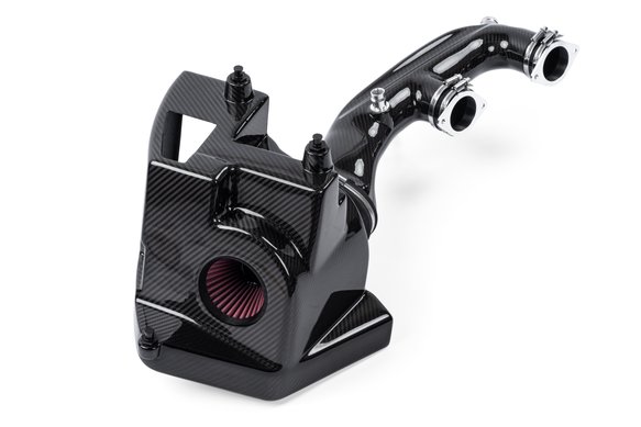 This is the ultimate intake upgrade for the Audi RS4 and RS5 (B9). It flows 36% more than stock, reduces pressure drop, and improves linearization across the turbos. This directly translates to +19 AWHP and +17 AWFT-LBS of torque on top of our Stage 1 (93) tune making this a simple upgrade for more power you can feel.Our system is a full upgrade as it replaces all of the intake components from the inlet scoop all the way to the turbo inlets. This is extremely important as focusing on the airbox alone does not address the main restrictions found in the factory intake system. Simply put, our system flows better than stock, makes more power, puts less strain on the turbochargers, looks sexy under the hood with the gorgeous carbon fiber design, and enhances the sound of the engine.The factory turbocharger inlet pipe is a big restriction point because it’s small. It’s common for most intake systems to only focus on the filter and airbox, but doing so only has minimal impact on performance. Furthermore, upgrading the turbocharger inlet pipe only has minimal impact on performance if it still necks down to with the factory or aftermarket intake airbox. We solve this by making our pipe as large as possible from the 4″ filter outlet all the way to the turbocharger inlets in one piece! This minimizes pressure drop and increases flow through the system far better than a multi-piece solutions.Our system is made from carbon fiber and looks absolutely stunning under the hood. By using this material we are able to make the wall-thickness of the tubes smaller, maximizing the internal diameter, increasing performance even more! The material also allows us to make complex organic shapes necessary when working in a tight engine bay.The airbox is fed from an inlet scoop that maximizes the flow path into the airbox. The airbox has cutouts allowing for additional flow paths directed away from the engine. This keeps air temps down, and increases sound without it being overbearing. The filter is massive as well. A big filter is desirable as increasing filtered surface area keeps the filter breathing easily for many miles as it filters dirt, dust, and particles. It measures 7″ by 7″ with a 5.5″ frontal inlet, and a 4″ outlet. The filter media is a washable pleated cotton gauze that can be cleaned for extended life, or replaced with ease.Our kit includes everything you need to bolt on and go. No new tuning is needed to run this product, and the product is emissions friendly. We include all new OEM gaskets and all the nuts, bolts, and clamps needed for an easy install. Lastly, thanks to our billet turbo inlet adapters, this is the only intake you’ll ever need. Should you later upgrade your turbo, new, larger adapters can be installed to adapt to the larger inlets simply by swapping out the billet adapters!