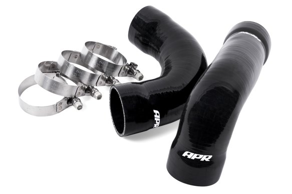 APR is pleased to present the ultimate boost hose upgrade for MQB platform vehicles with the 1.8T and 2.0T engines!The APR Boost Hose System is a comprehensive, direct replacement upgrade, to the factory rubber hoses found in the charge piping system. The system includes a multitude of enhancements designed for maximum performance, longevity and insurance against power robbing boost leaks. The system is sold both as a complete kit, and individually, and is fully compatible with the OEM and upgraded APR Intercooler system, OEM throttle body and all OEM turbochargers.This system includes the turbo outlet hose, throttle body hose, and both intercooler hoses.APR’s Engineers took a multi-step approach to optimizing the hoses to minimize boost leaks, reduce turbulence and other performance degradations. Four-ply silicone was utilized as it provides the thickness and strength characteristics necessary to support boost levels far beyond the engine’s capabilities. A Fluorosilicone internal lining was added to ensure the hoses do not rapidly deteriorate over time when exposed to oil and gasoline from the PCV and EVAP systems. The included stainless-steel Clampco T-bolt clamps prevent the hoses from coming loose under heavy pressure and under high temperatures, silicone adheres to its mating surface, further minimizing leaks and hose slippage. APR’s EZ-Flow stepped design creates a smooth airflow path, reducing turbulence over non-stepped designs. Finally, silicone provides better heat resistance over rubber, extending the life of the product and ultimate