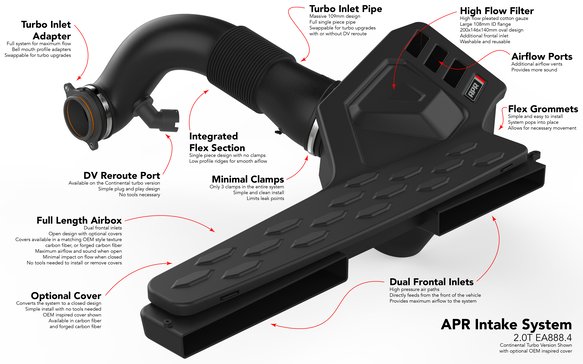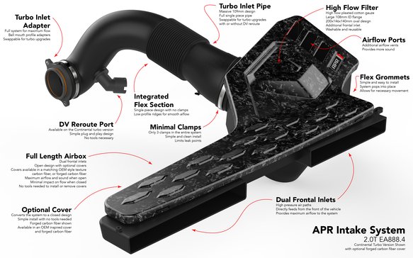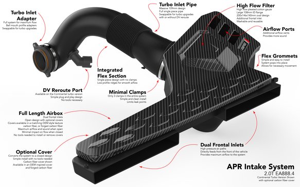 The APR Full Intake System for the 2.0T EA888.4 Engine is Here!This is the ultimate intake system for the 2.0T EA888.4 Engine. It’s a true full 109 mm intake system from the dual frontal inlet scoops all the way to the included turbocharger inlet adapter connecting directly to the turbo. The system is completely configurable making it an open or closed system, both with OEM inspired cover or more stylish carbon fiber covers in both twill and forged carbon fiber. The system is also compatible with stock and larger turbocharger systems, both OEM, hybrid, and aftermarket thanks to swappable back tubes and turbo inlet adapters. The system flows dramatically more than stock, has lower pressure drop, increases horsepower & torque, sounds better, looks better, is completely configurable to your desire, and comes in at a price point that’s unbelievably affordable. This is the only intake system you’ll ever need!