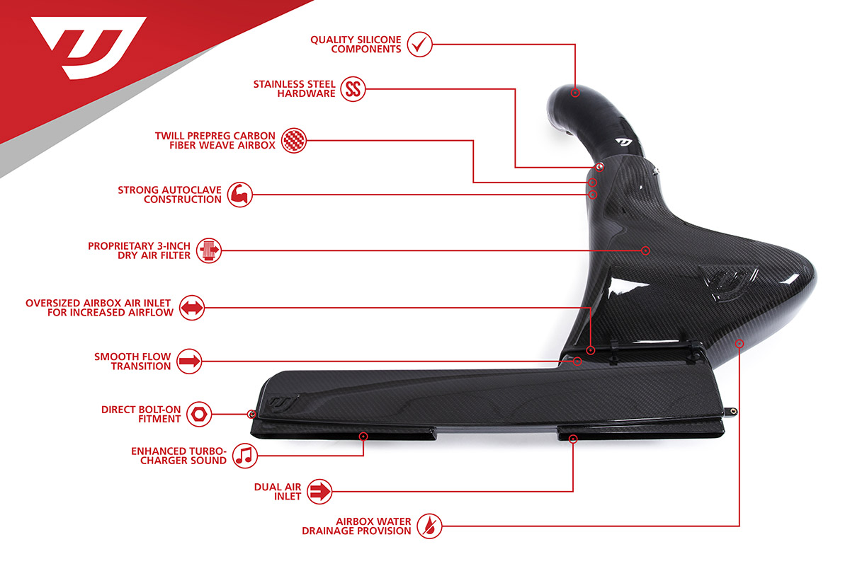 This translates into a complete Cold Air Intake System that is sure to perform to the maximum, providing increased power, air velocity, and throttle response, while also decreasing air intake temperatures and turbo lag. Unitronic’s Carbon Fiber Air Duct also helps to increase power and air flow by taking advantage of both air inlets available in the OEM grill.