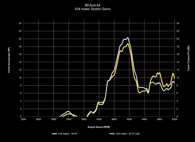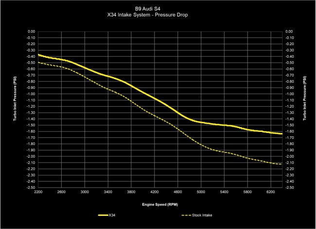 The X34 Carbon Fiber Full Intake System for B9 Audi S4/S5 was engineered with performance in mind, and is a free-flowing replacement for the factory airbox and turbocharger inlet hose. As the development of this intake progressed, the X34 Carbon Fiber Full Intake System yielded measurable reduction in pressure drop at the turbo inlet compared to the factory airbox, with a corresponding increase in horsepower and torque throughout the powerband.